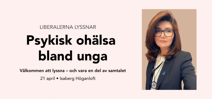 Liberalerna Lyssnar: Psykisk ohälsa bland unga – hur kan vi rädda liv tillsammans? Tisdag 21 april 2026 18:00–20:00 Isaberg Höganloft, Hestra